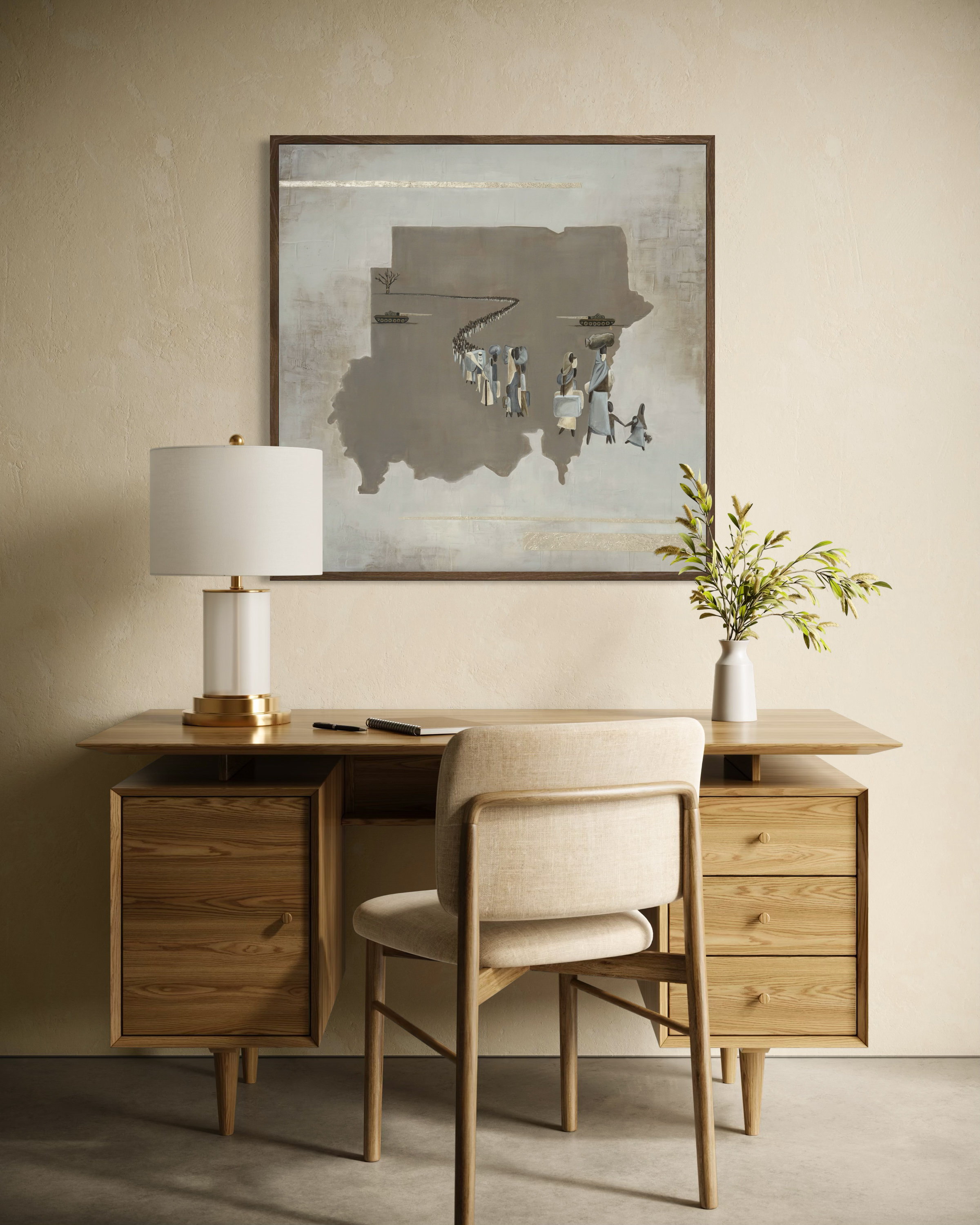 This work depicts the war in Sudan, which began in April 2023 between two rival military factions: the Sudanese Armed Forces (SAF) and the Rapid Support Forces (RSF).