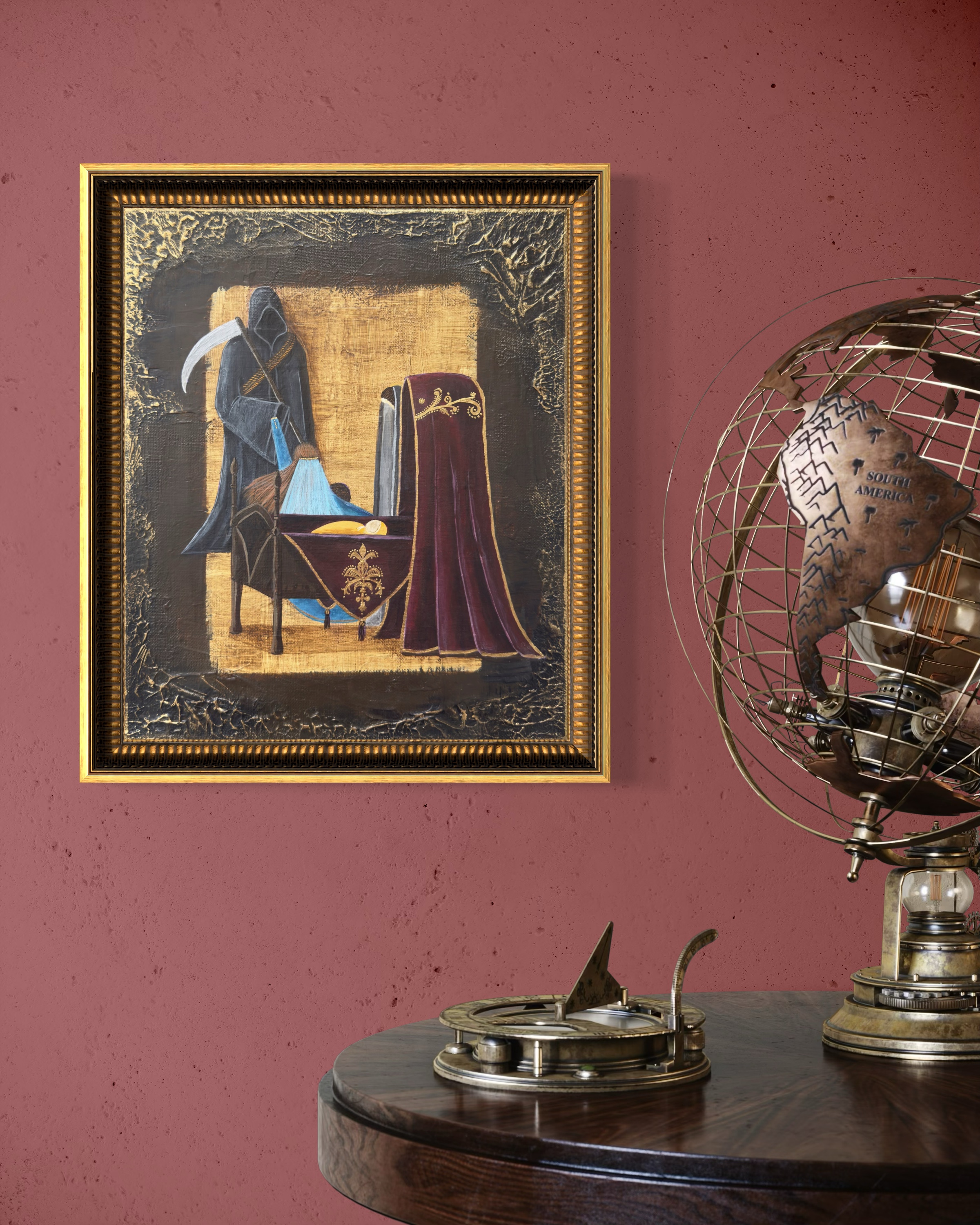 At the center of the composition, a sleeping infant lies in a cradle—peaceful, unaware of the fate that awaits him.