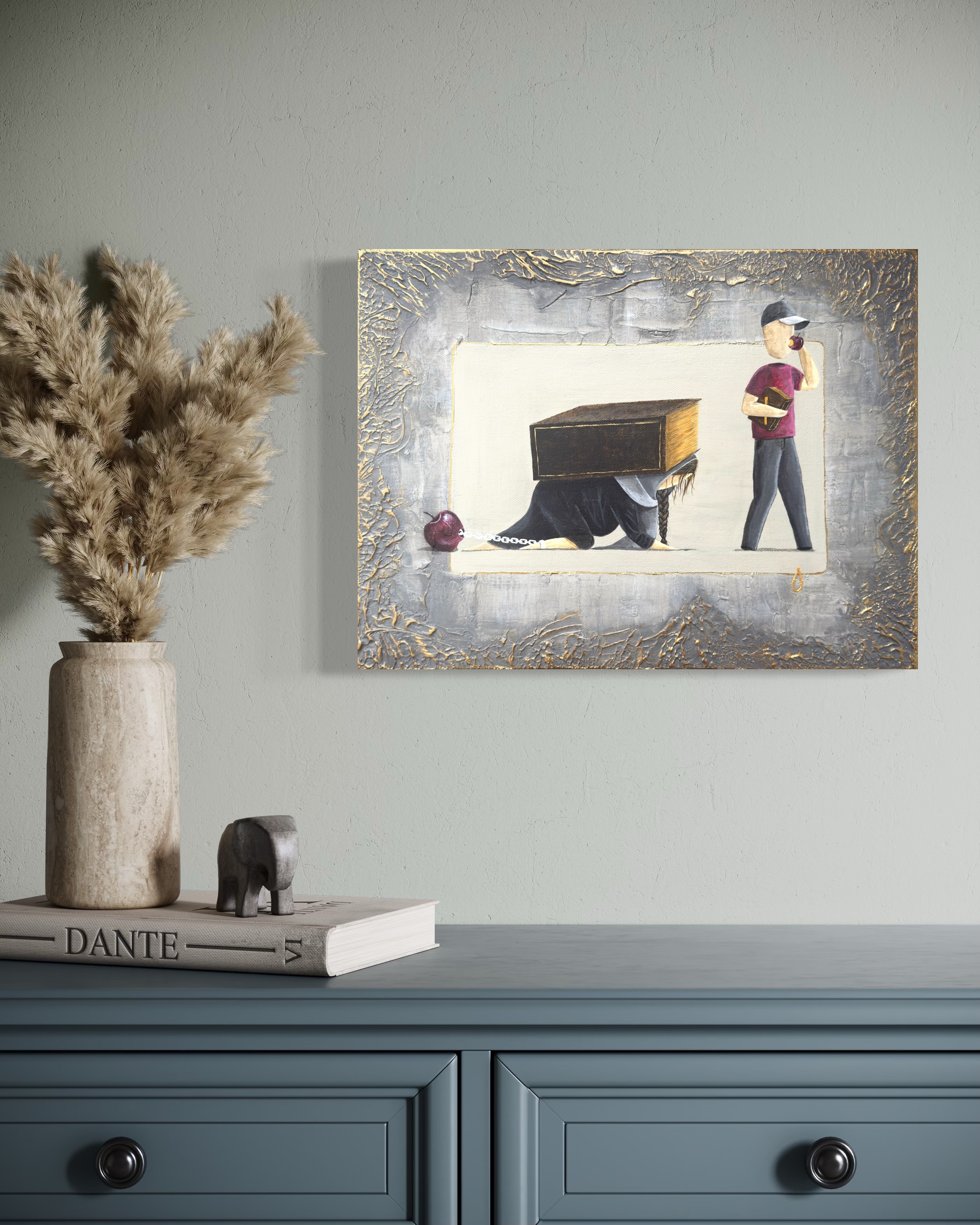 This painting portrays a man and a woman moving along the same path. The man walks upright, eating an apple, holding a book. Behind him, the woman follows—but she is crawling, exhausted, barely able to move. Her book is heavier and she is pregnant, carrying not only her own weight, but the burden of what is passed down. At her feet lies a massive apple, a dead weight that slows her even further. And near the man, a pen. He wrote the book.